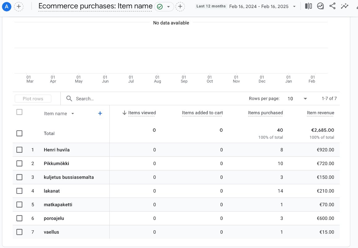 Tapahtumat alkavat virtaamaan GA4:aan ja voit seurata tapahtumia sekä konversioita ("key eventteja"). Osto merkataan automaattisesti "key event":ksi. Lue lisää