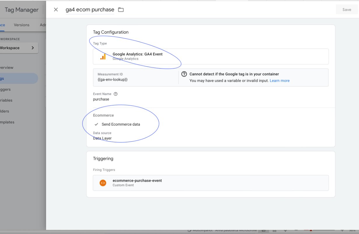 Lisää GA4 tapahtuma-tagi GTM:aan osto-tapahtumaa varten (ja halutut muut tapahtumat). Julkaise säilöt.