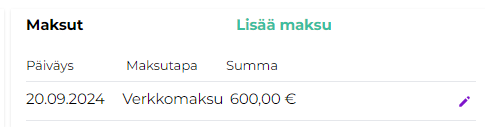Maksumerkintä ilmestyy laskulle, ja voit muokata tai poistaa sen painamalla kynä-symbolia maksumerkinnän oikeassa reunassa. Jos lasku on sidottu tiettyyn varaukseen ja laskun summa vastaa varauksen kokonaissummaa, Moder merkitsee automaattisesti myös kyseisen varauksen maksetuksi.