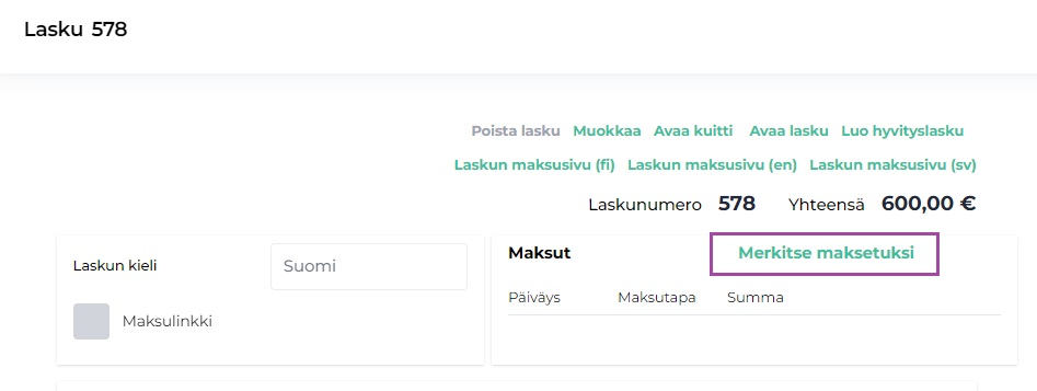 Paina "Merkitse maksetuksi" -painiketta laskulla. Tämä luo maksumerkinnän laskulle ja varaukselle.