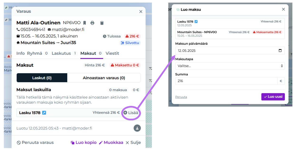 Avaa varauksen esikatselu varauskokonaisuudesta, johon lasku liittyy. Siirry Maksut-välilehdelle. Voit klikata laskun kohdalta suoraan "+ Lisää"