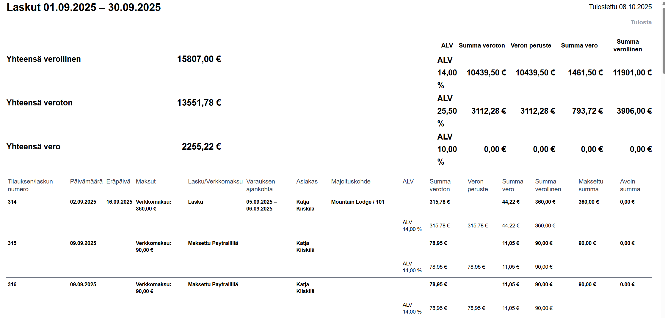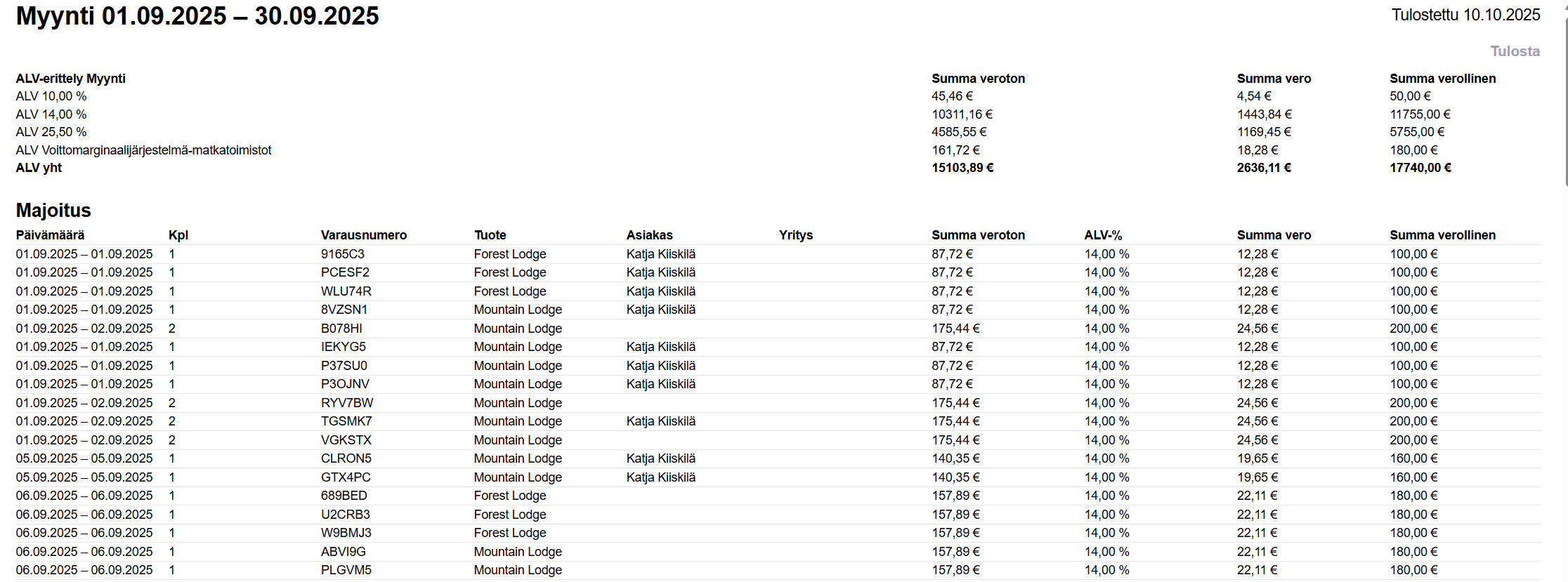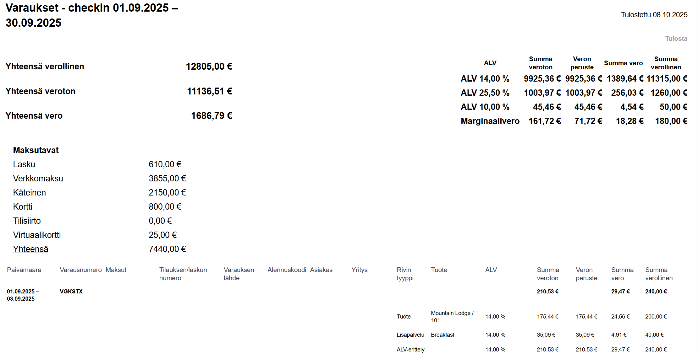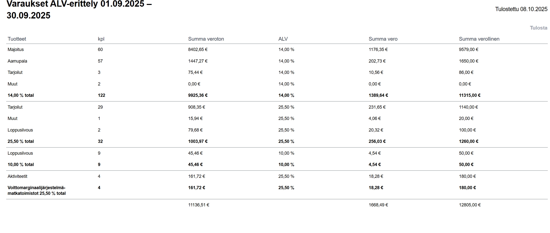 - ALV-kannoittain erittely: Raportti listaa ALV-kannoittain varausten kokonaissummat.