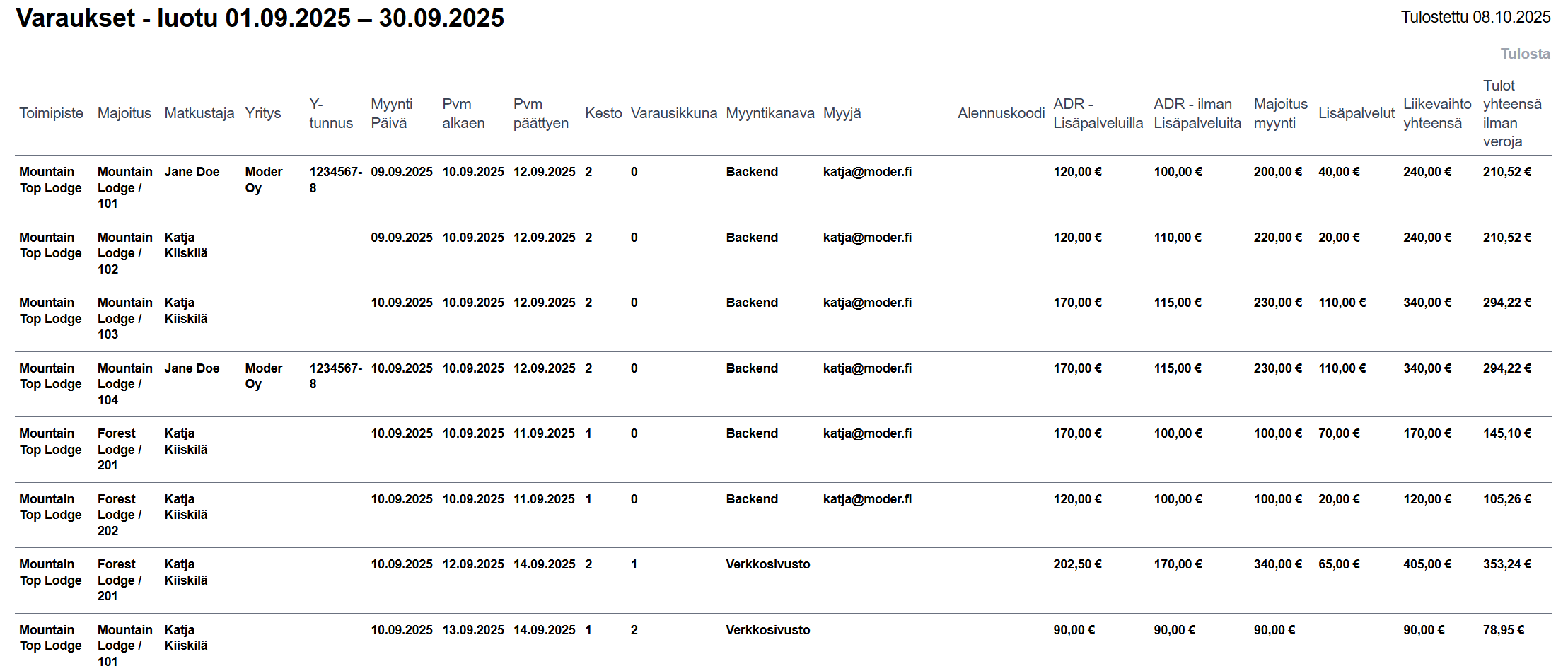 - Varauksen tiedot: Varausten ajankohdat, varausnumero, matkaajan nimen, laskun numero, myydyt tuotteet ja niiden ALV-erittelyt.