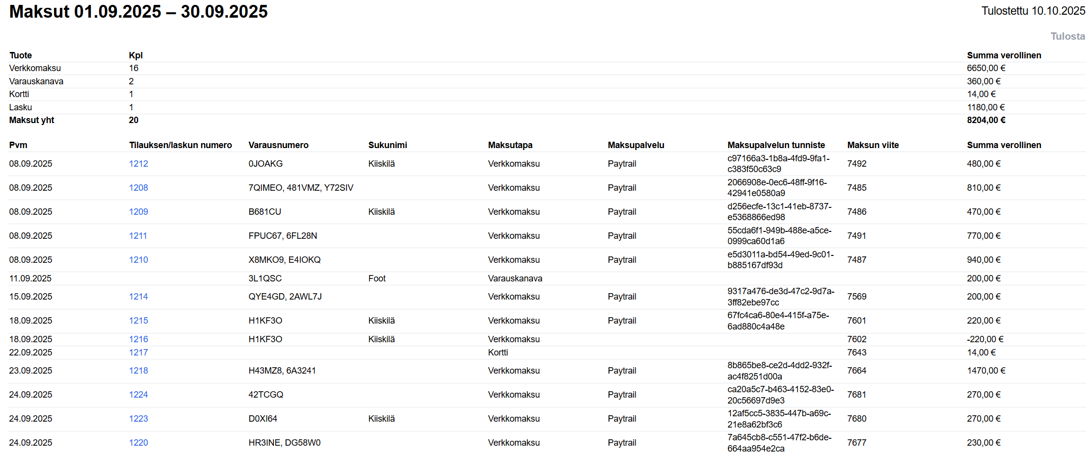 - Maksujen kokonaismäärät: Kaikki maksut maksutavoittain, kappalemäärittäin ja yhteenlaskettu maksujen märää.