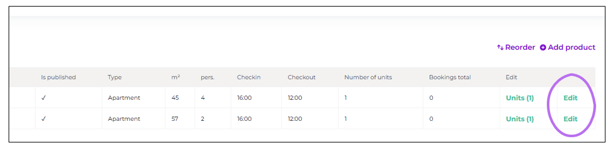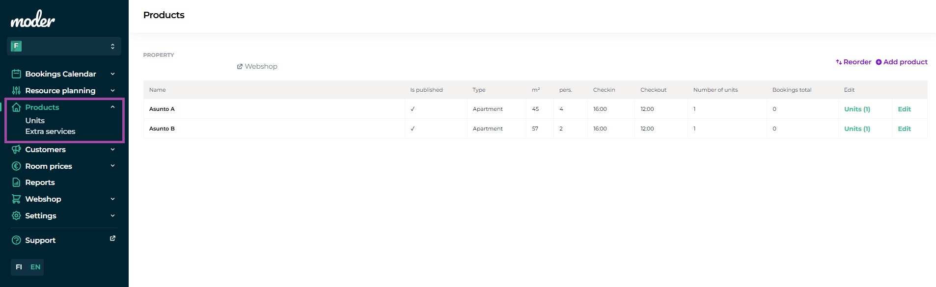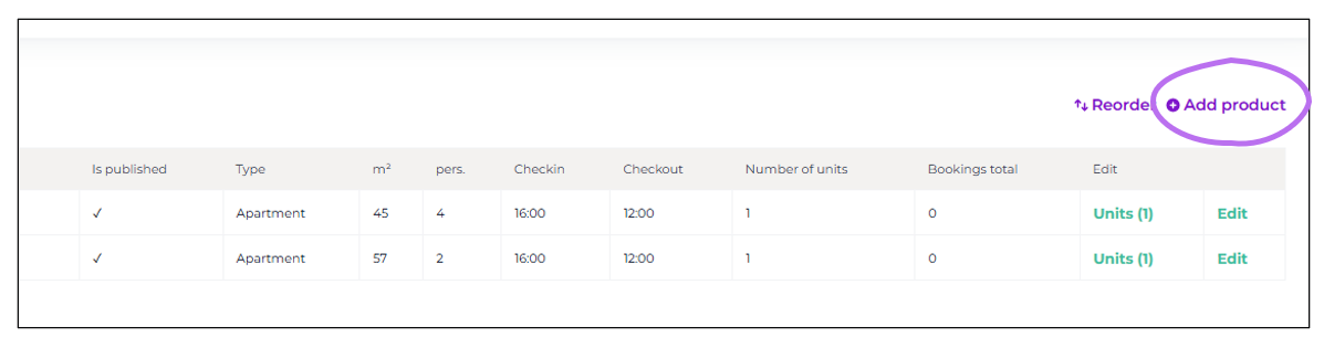 When you want to create additional accommodations, click the "Add product" button on the right. This way, you can create all the accommodations and other products you need in your Moder.