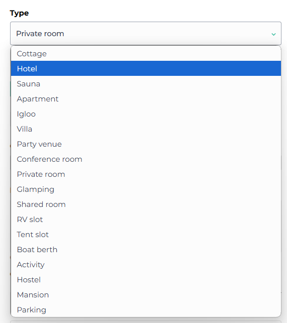 Next, select the type of accommodation from the dropdown menu. This information will also be visible to your customers in the webshop.