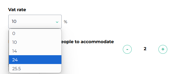 Choose the appropriate VAT rate for your product from the dropdown menu. Common VAT (in Finland) rates for accommodation services include 10% or 24%, depending on local tax regulations and the type of product. The selected VAT rate will be displayed to the customer during booking and invoicing.