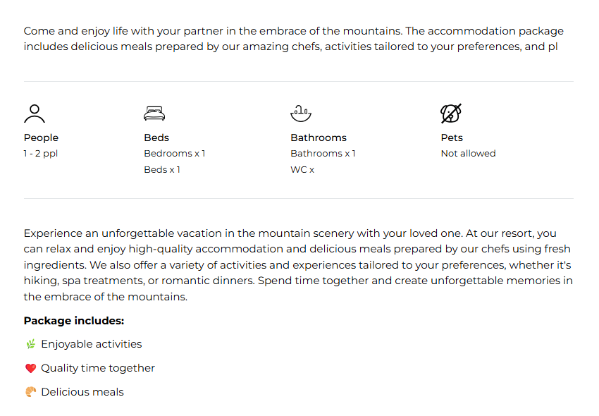 Moder tip! By using formatting, your product descriptions become more appealing to travelers. To break up longer descriptions and group content visually, add --- to insert a horizontal line within the text.