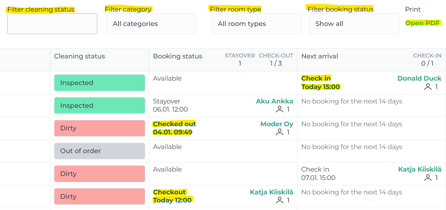 This neat and compact overview shows you a list of arriving and departing reservations. The overview also includes all booked extra services and the cleaning status of rooms.