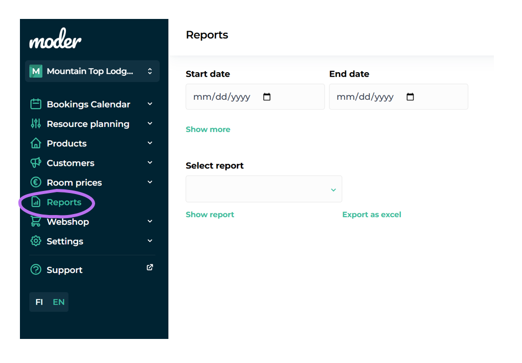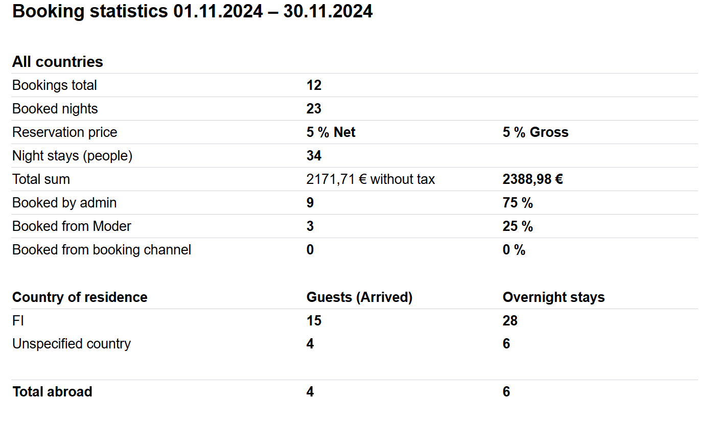 Moder does not yet offer direct integration with Statistics Finland, so figures must be manually retrieved from this report and entered on Statistics Finland’s website. - Reservation sources: The report shows how many bookings originated from different sales channels, such as external booking platforms ("Booked via external booking channel") and your webshop ("Booked via booking page").