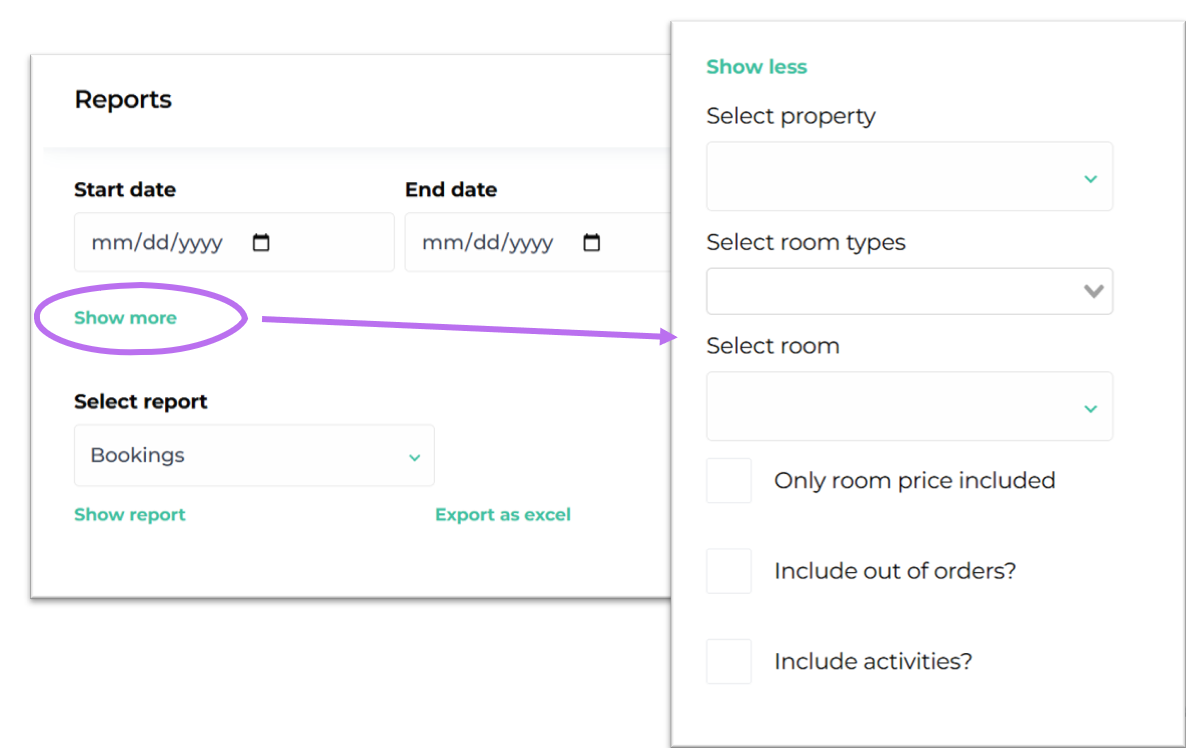 - Bookings: Shows all bookings that began within the selected period. This report helps track which bookings commenced during the given period.