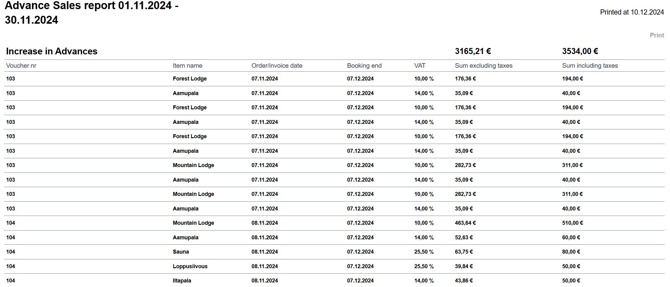 - Advance sales report: Tracks prepayments and their statuses, assisting in monitoring payments related to future bookings.