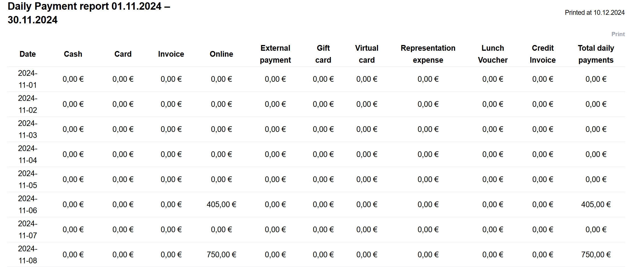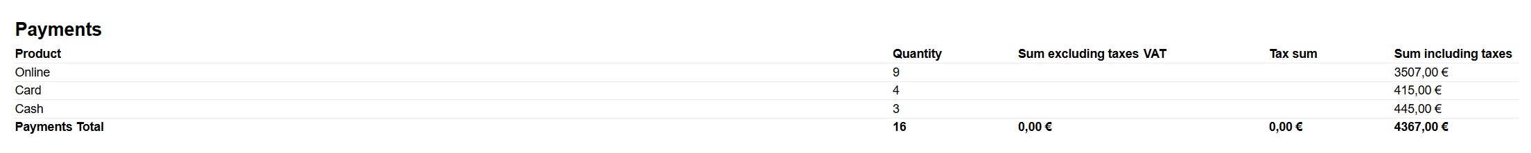- The report displays how much was recorded for each payment method on a specific day, such as card payments, gift cards, cash payments, etc.