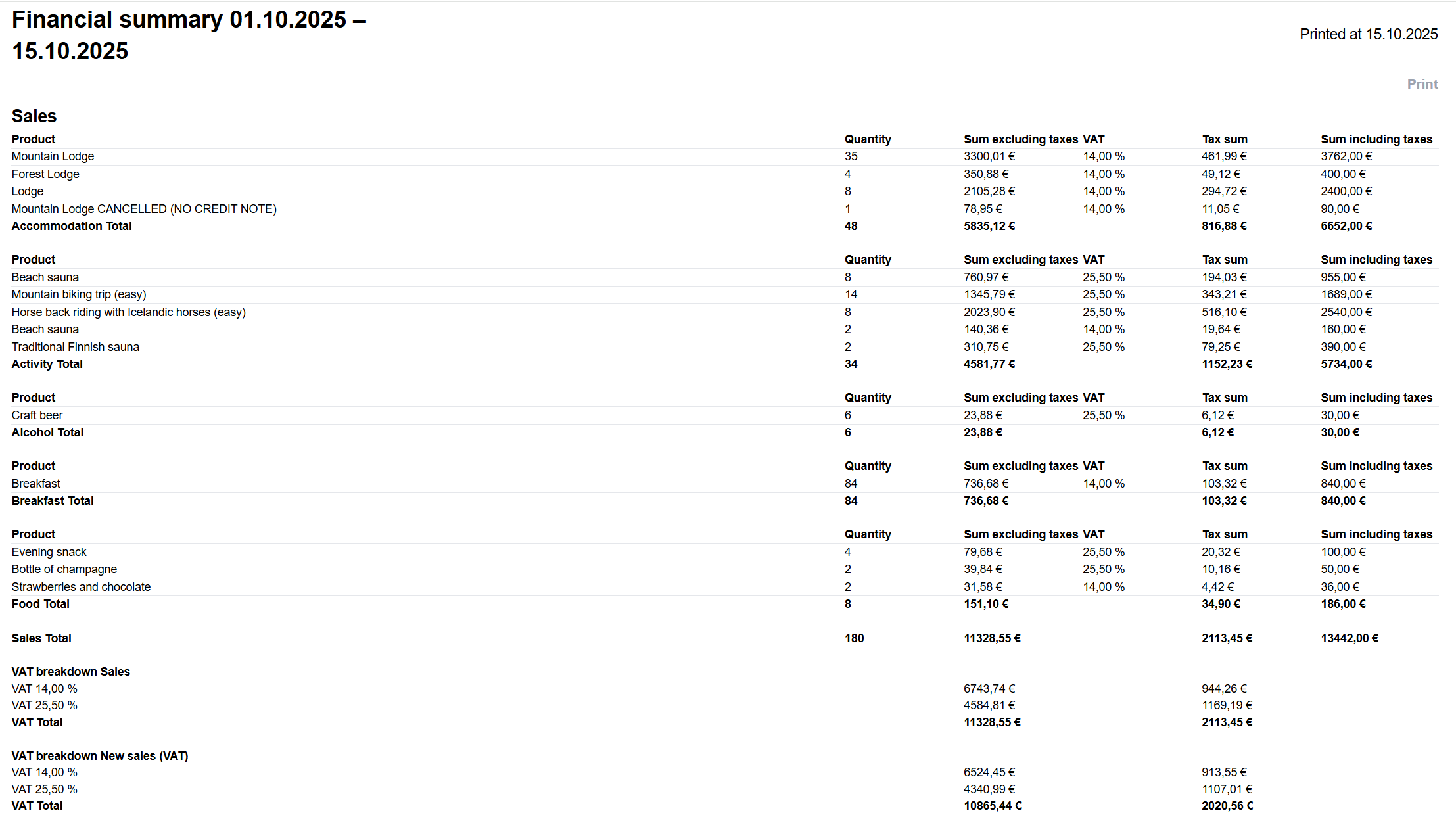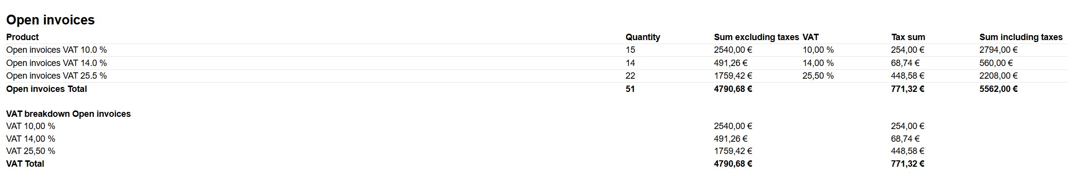- The report conveniently categorizes products and services based on different VAT rates, simplifying tax and accounting management.