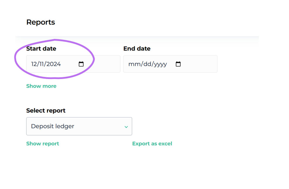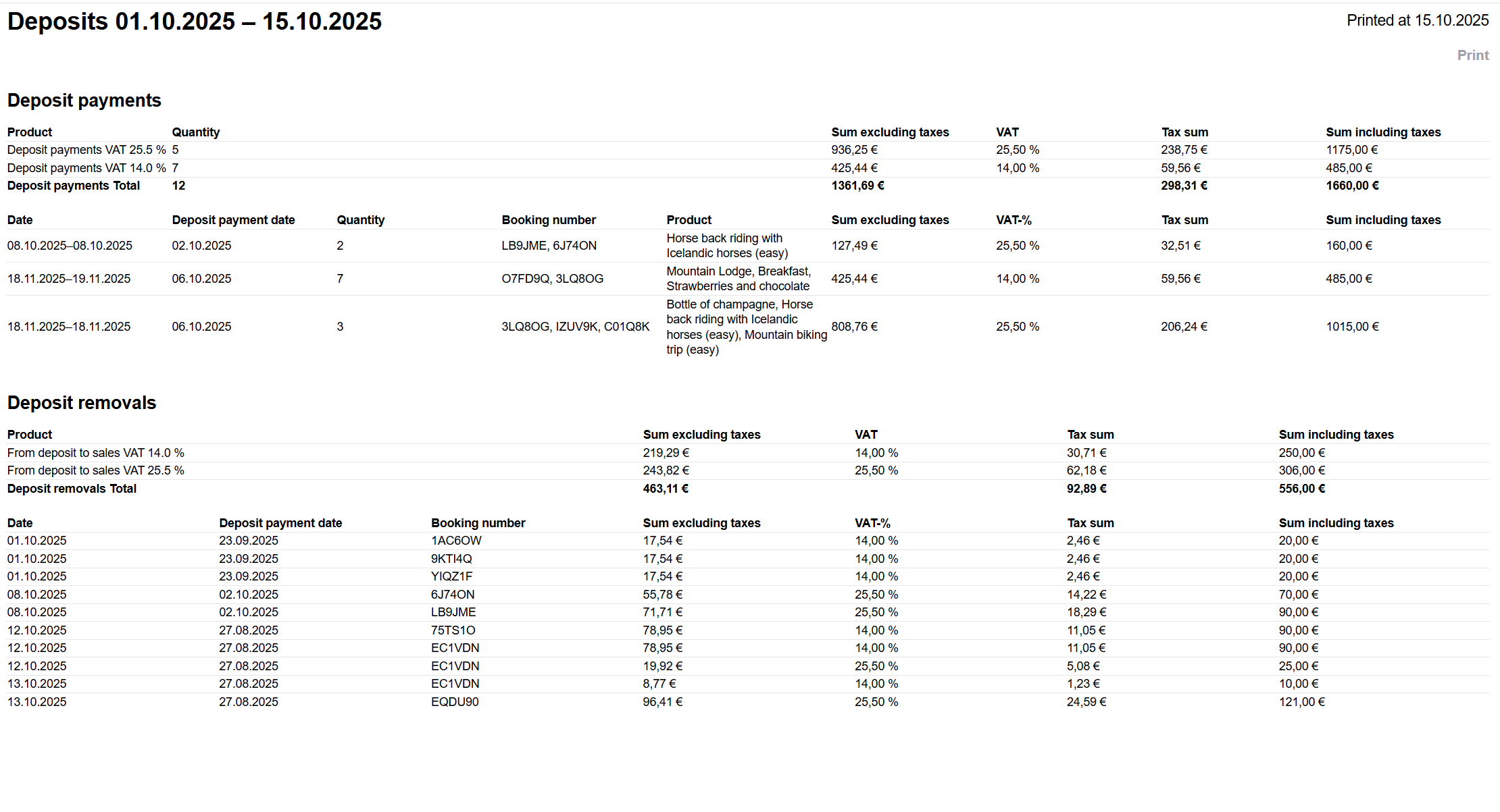 The Deposit ledger report compiles prepaid reservations (including invoices or online payments) from today onwards.