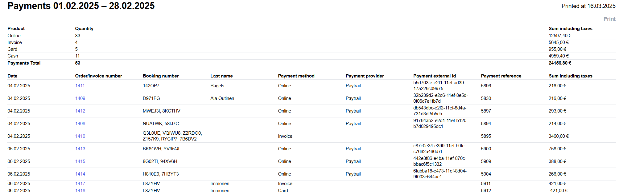 - Lists payment methods, such as online payments processed through Paytrail or Stripe, separately.
