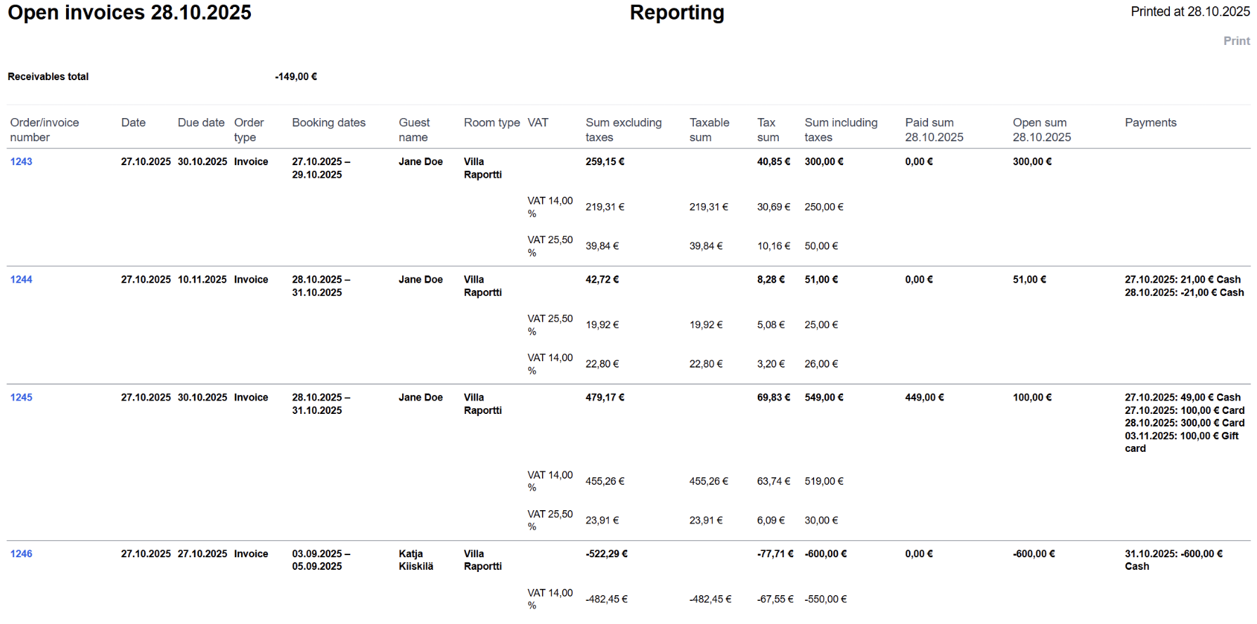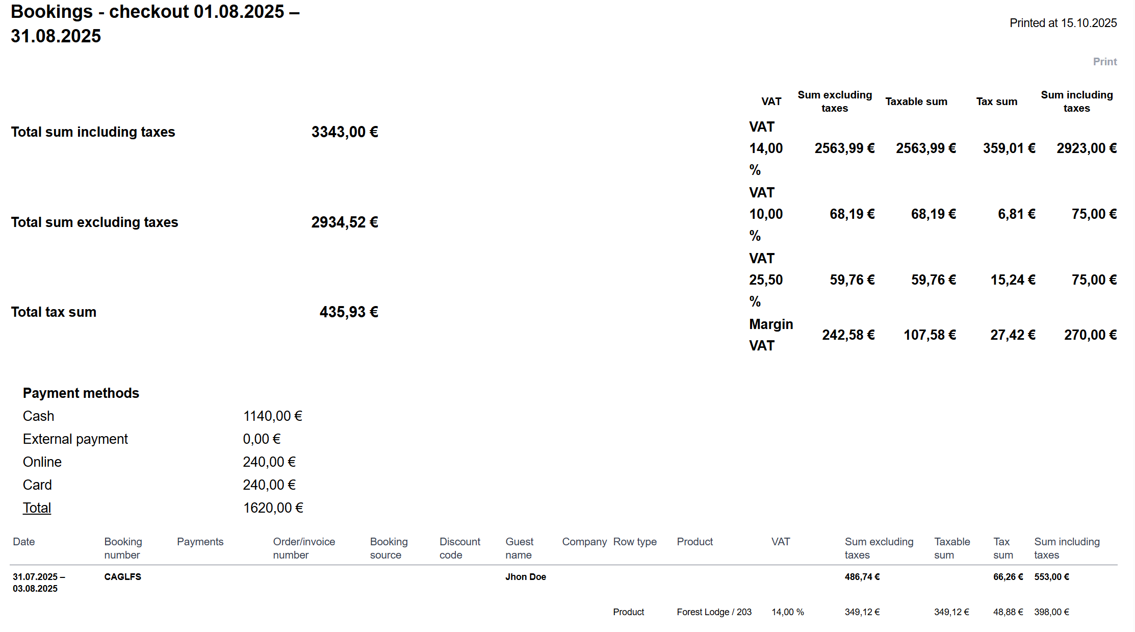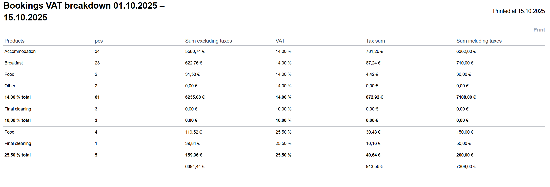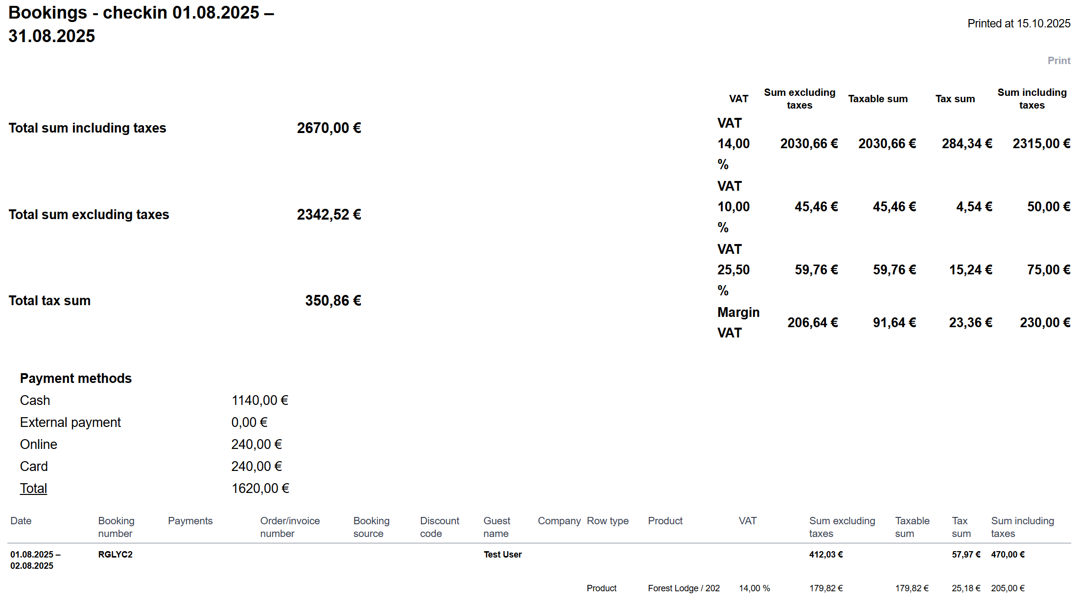 - If the "Total sum including taxes" and "Payment methods total" amounts do not match, this indicates that there are bookings in the report that have either not been marked as paid or have overpayments (payment entries exceeding the booking amount). In such cases, check the payment entries for completed bookings in the selected time period.