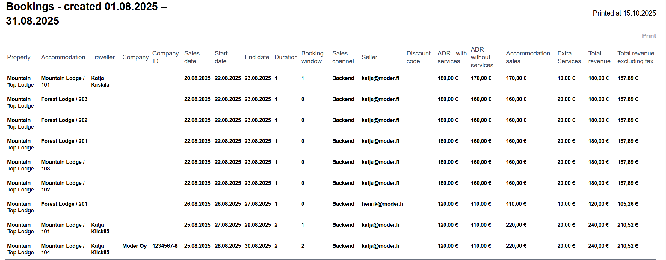The Bookings - created report provides a detailed overview of all bookings created within the selected time period.