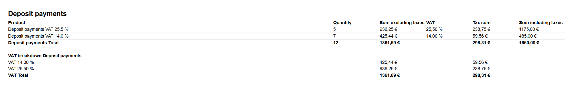 - Sales sorted by tax: Breaks down sales by VAT rates.