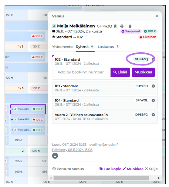- Valitse ryhmävarauksen päävaraus, jonka erotat helposti vaaleanvihreästä sävystä