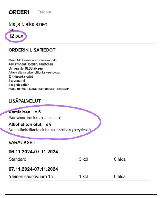 3. Orderi avautuu helposti tulostettavaan muotoon. Orderin lisäpalvelut, pax-määrä sekä varaukset tulevat suoraan yhteenvetona kokoo ryhmävaraukselta: