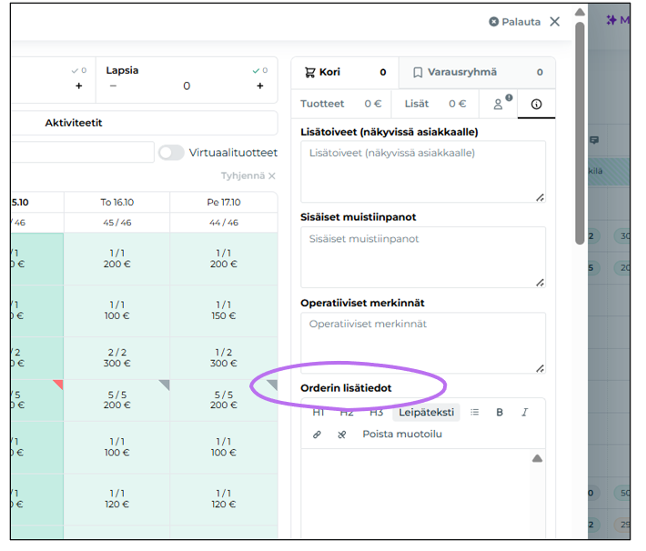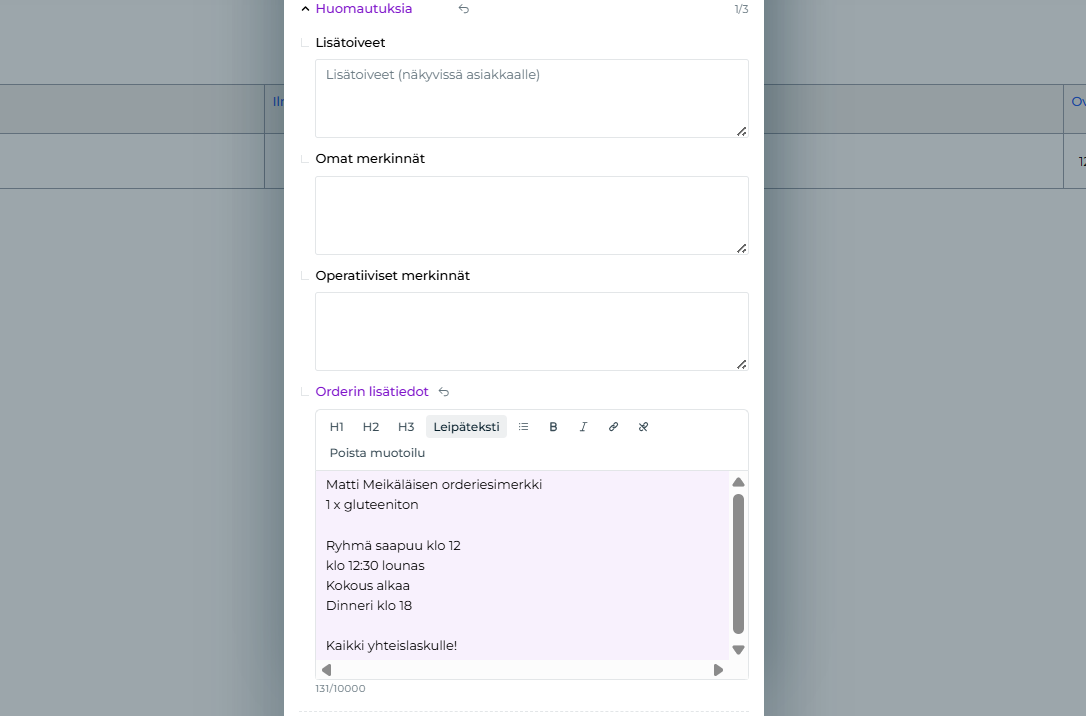 Orderi on Moderissa vapaan tekstin kenttä pienillä tekstinmuotoilu mahdollisuuksilla ja voit lisätä orderiin 10 000 merkkiä. Muista painaa Tallenna varauksella lopuksi, kun olet lisännyt orderin tiedot!