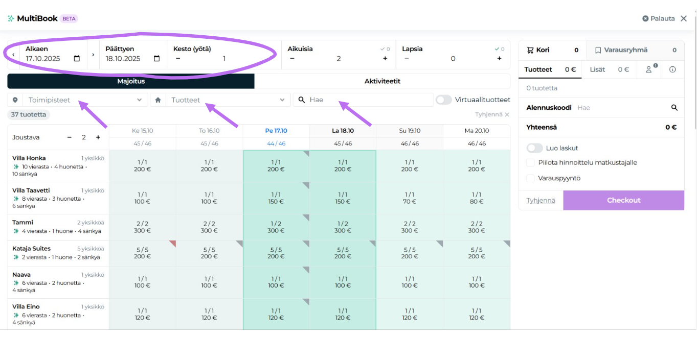Työkalun käyttöä on opiskeltu tarkemmin varausten luonti majoitukselle ja aktiviteeteille osiossa. Yksityiskohtaiset ohjeet ja vinkit työkalun käyttöön sieltä. Tässä osiossa keskitymme isompien varauskokonaisuuksien luomiseen ja hallintaan.