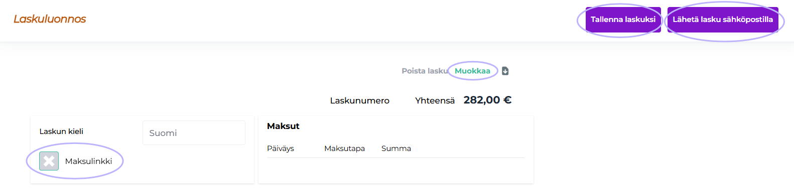 Kun muokkaukset on tehty, paina "Tallenna" ja lähetä maksulinkki painamalla "Lähetä lasku sähköpostilla".