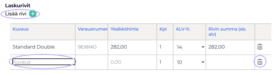 Jos haluat muokata laskua ennen lähetystä (esim. lisätä laskurivejä), paina "Muokkaa". Muokkausnäkymässä voit tehdä tarvittavat muutokset, kuten lisätä tai poistaa rivejä, muokata hintoja, ALV-kantaa ja maksuehtoja tai lisätä laskulle vapaata tekstiä.