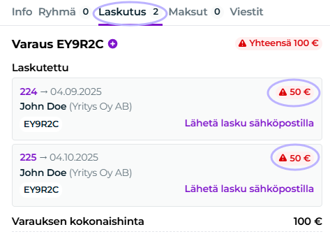 Tallenna, jonka jälkeen molemmat laskut näkyvät nyt varauksen Laskutus -välilehdellä:
