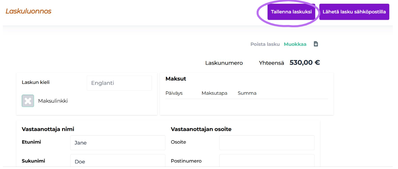 Klikkaa siis ensin "Tallenna" ja tämän jälkeen vielä "Tallenna laskuksi".