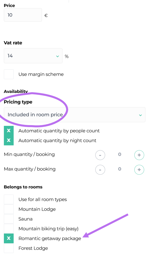 - Assign an internal price to the extra service if its portion of the total package price needs to be itemized on receipts and reports, for example, due to differing VAT rates. In this case, set the pricing method for the add-on to "Included in room price." Such an add-on could be, for instance, breakfast or an alcoholic beverage with a different VAT rate than accommodation.