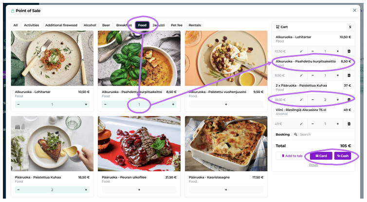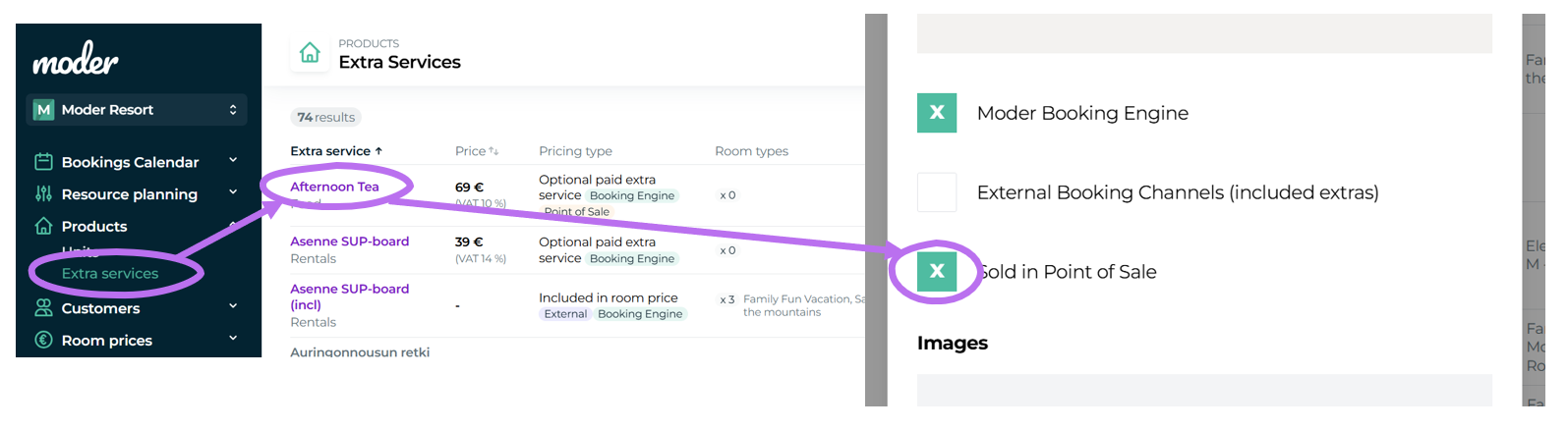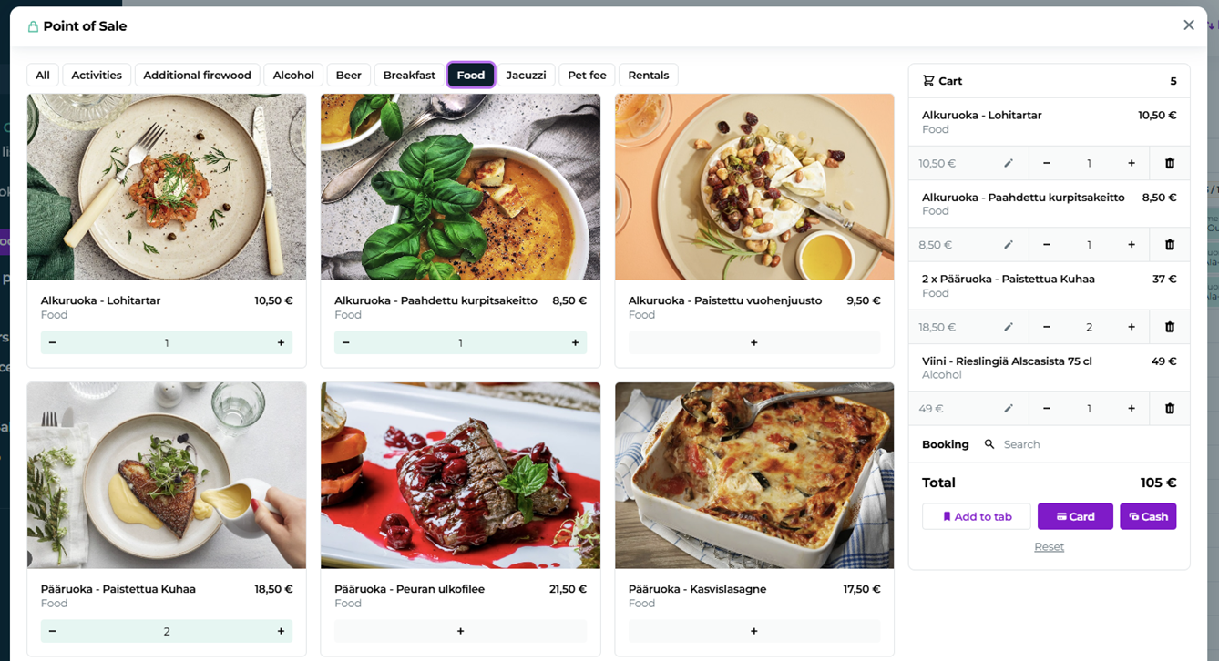 Moder Tip! Manage which products are visible in the POS via the Products / Extra services feature by marking them as available in POS. You’ll learn more about this in the 2. Building and editing accommodation product course.