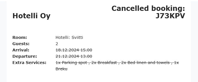 Below is an example of a received cancelled-notification email. It also includes the booked additional services, the reserved product, as well as the check-in and check-out times.