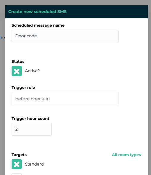 Next, set a title for the text message, such as "Door code", specify the number of hours for the scheduling rule (e.g., 2 hours before arrival), and select the products for which the text message will be sent. Finally, click the Save button, and voilà, you're done!