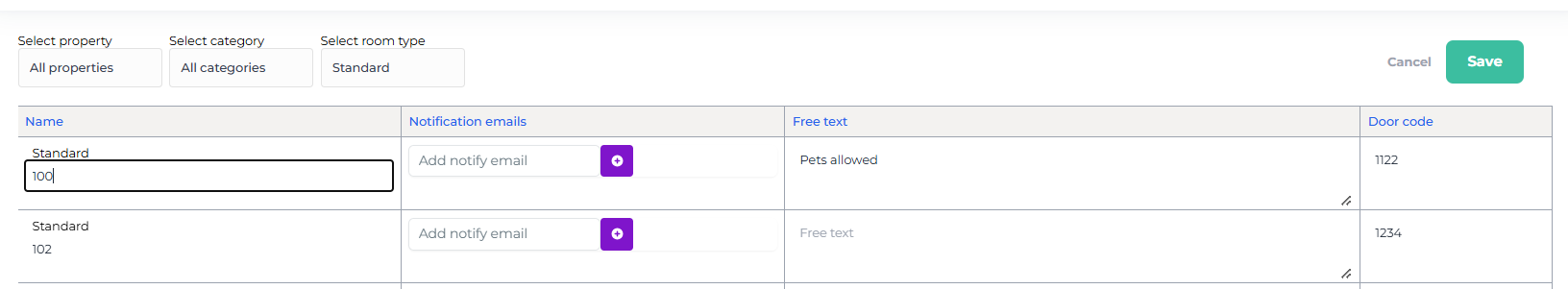 From here, you can view unit names, notification email addresses, additional details, door codes, and bookings all in one place.