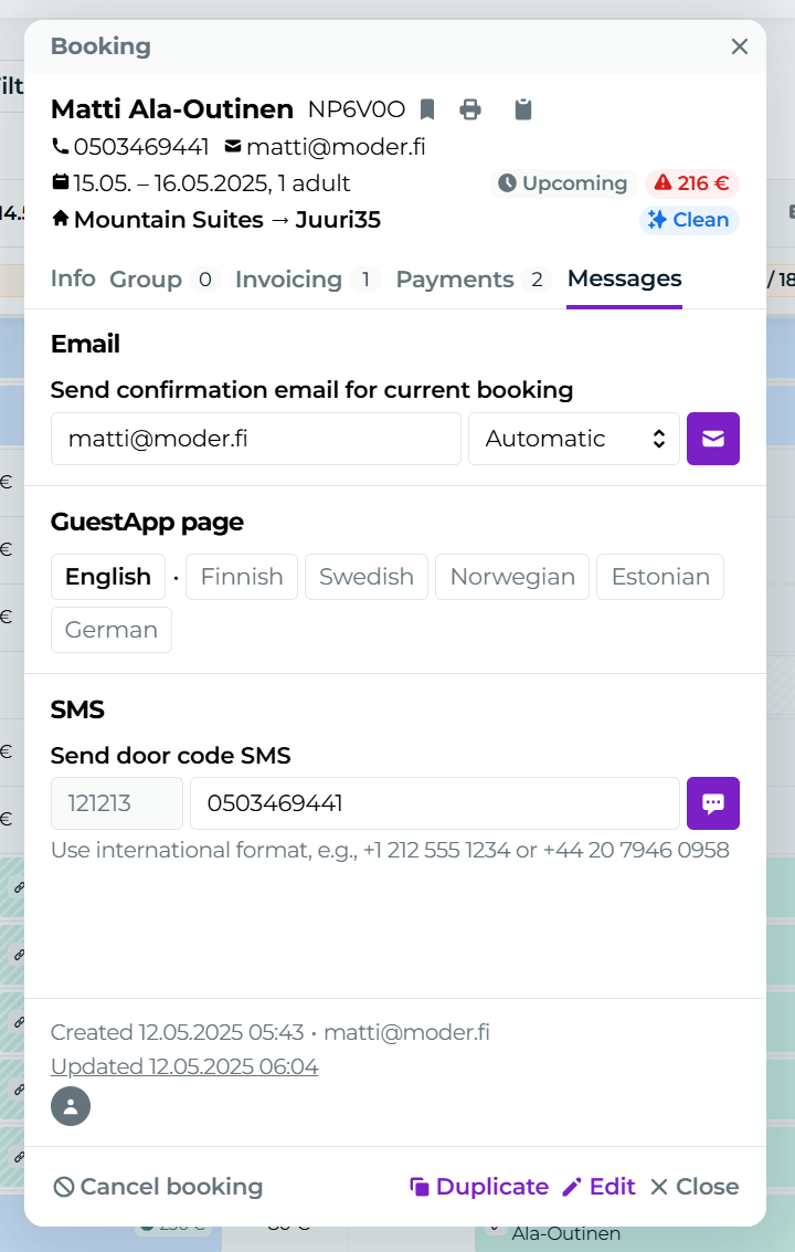 You can also send the door code manually from Moder to the customer at a time of your choosing.