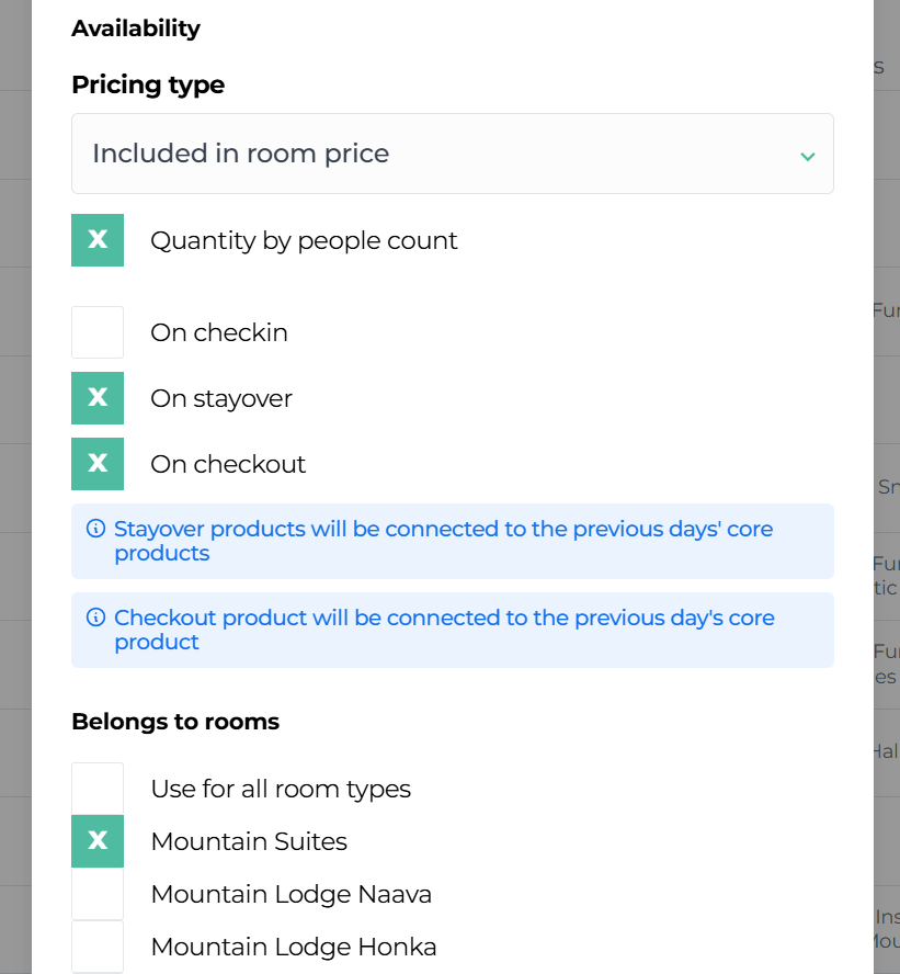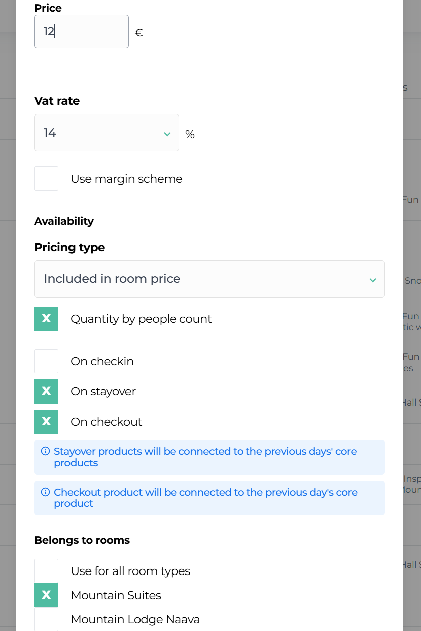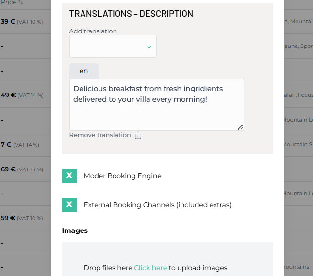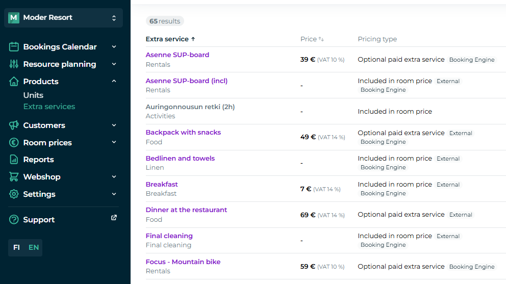 Check the box for "Moder Booking Engine" to make the extra service available for travelers to purchase in your webshop. Also, check the box for products where the service is included in the accommodation price!
