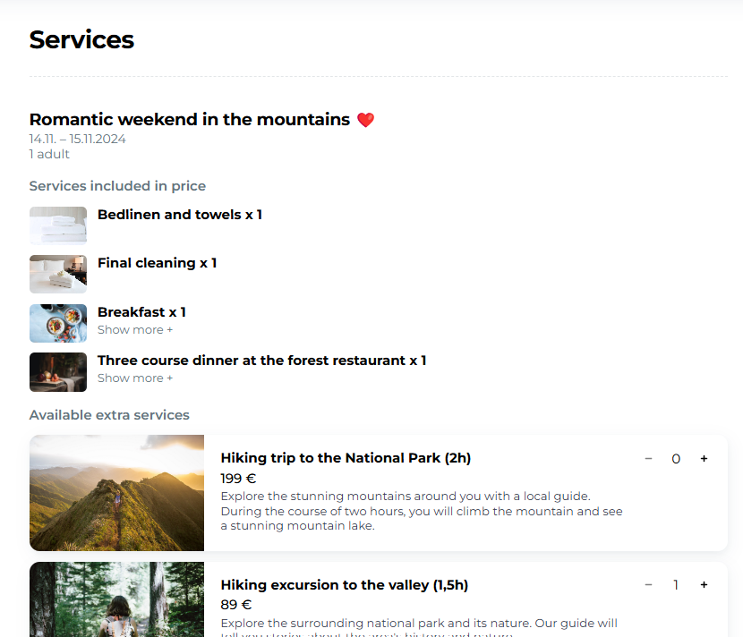 Paid extra service: In this example, the extra service, final cleaning, is not included in the accommodation price. However, the traveler can choose it as an optional add-on when booking through the online store.