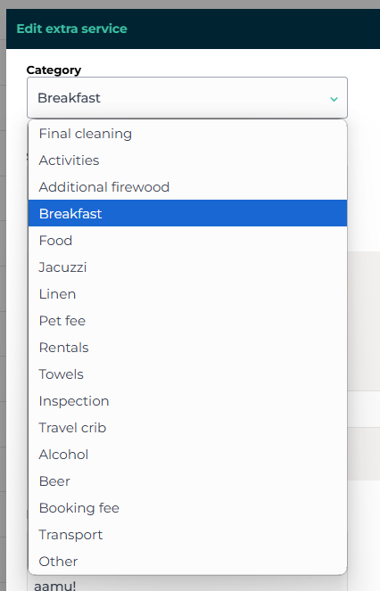 Moder already includes predefined categories for certain extra services, but you can also select the "Other" category if your service does not fit into any predefined categories. This category is only visible to you and will not appear to your customers.