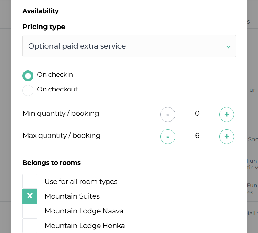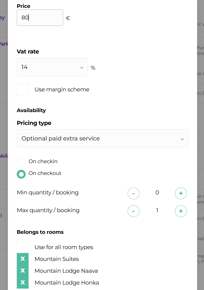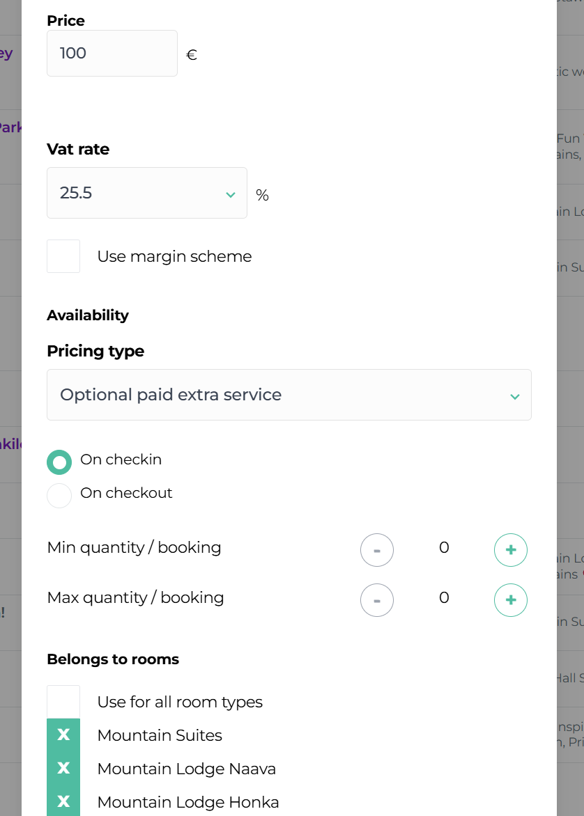 Note! If the minimum quantity is also set to 1, the webshop would require the traveler to select the extra service as a mandatory paid addition to the accommodation. Please note that this is not allowed. A mandatory extra service is only permitted if its price is set to €0.