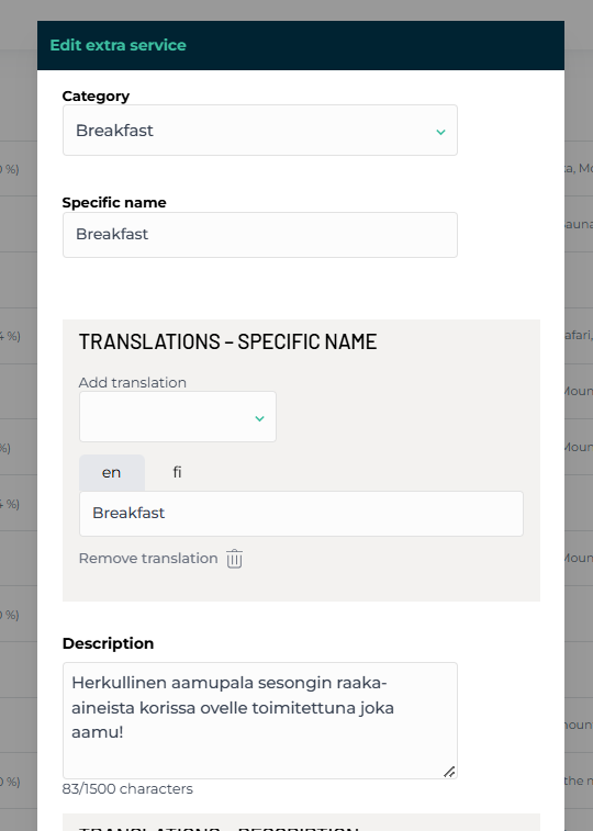 You can name the extra service as you wish and add translations in different languages. You can also provide a more detailed description of the extra service if desired.