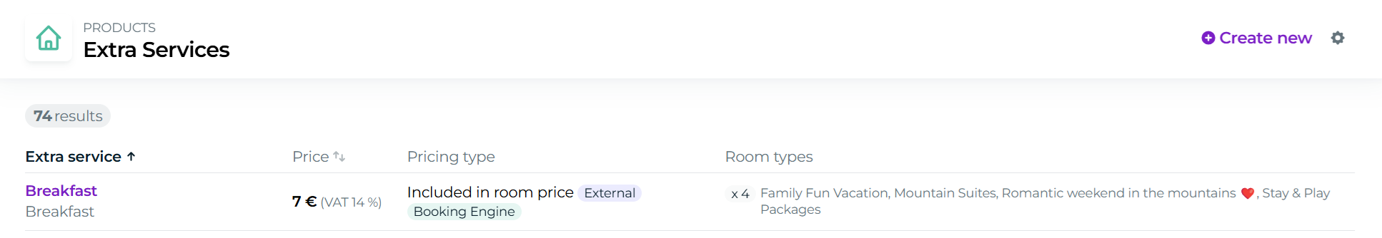 Click the "Create new" button in the top-right corner to add a new extra service.