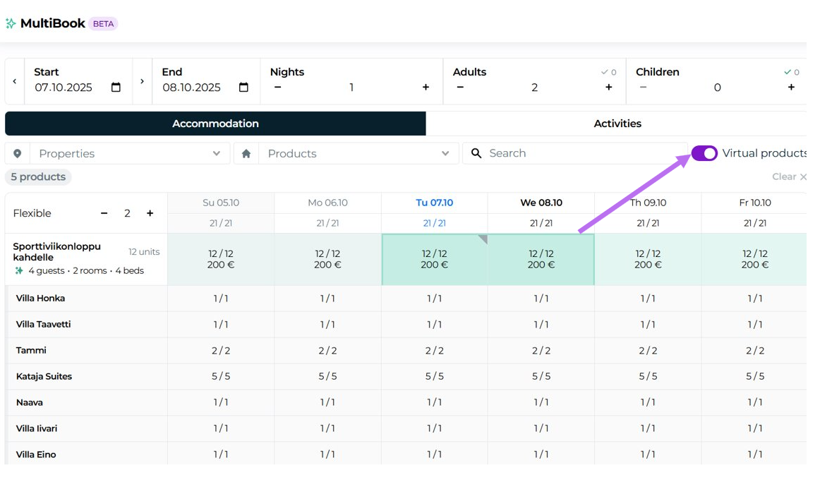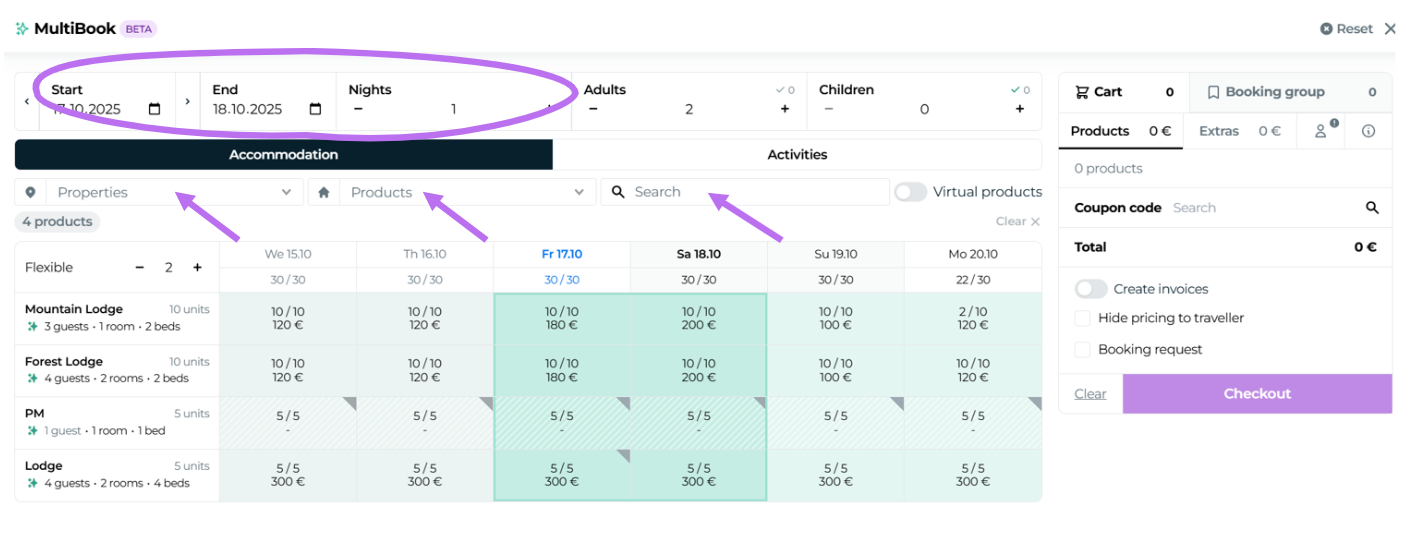 In MultiBook, accommodation products can be added to the cart in two different ways, offering a smooth and flexible reservation process. You can either use MultiBook’s automatic selection feature or customize the booking manually by selecting products directly from the calendar.