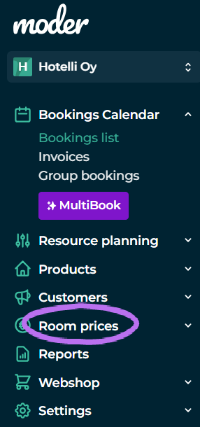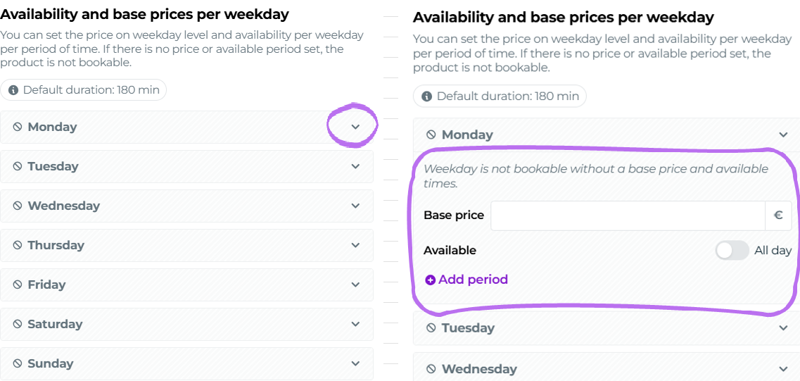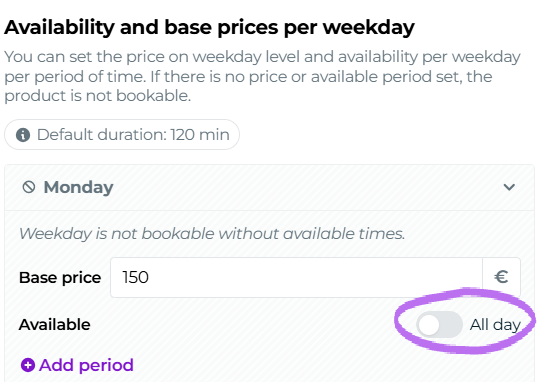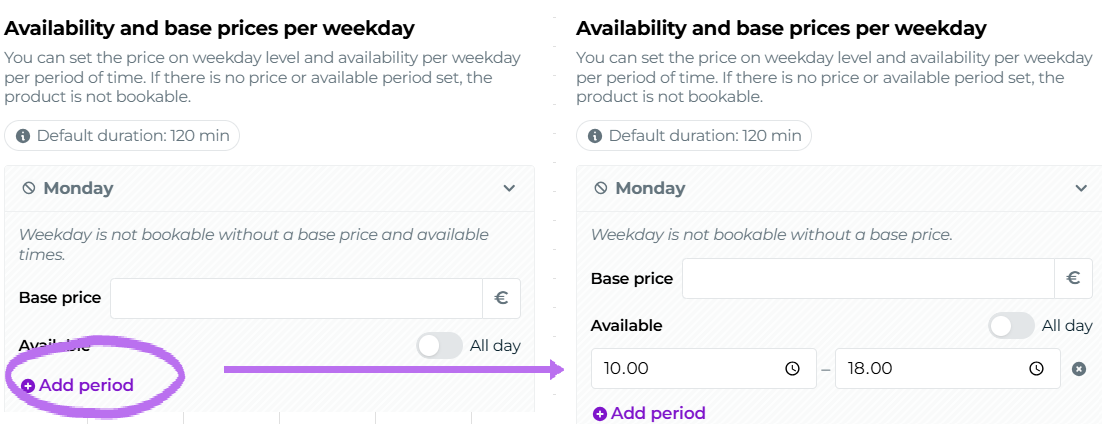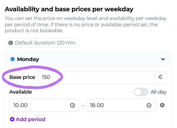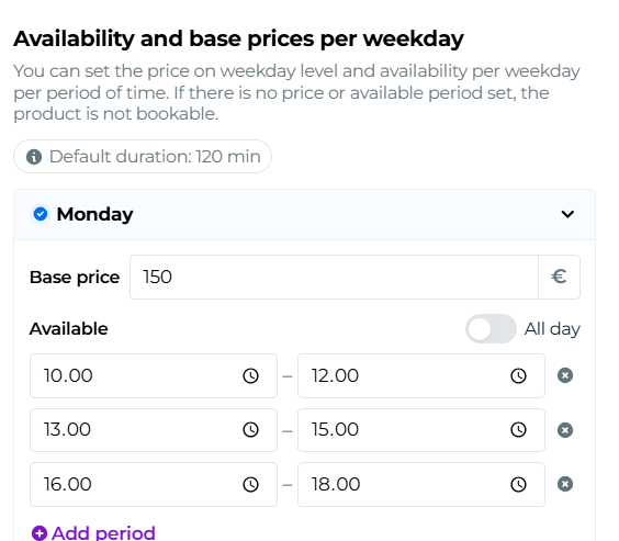 Just like with accommodation pricing, seasonal pricing for activities in Moder can be conveniently managed through the duration of the base price.