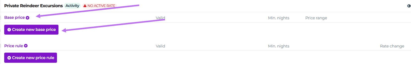 Base pricing is set individually for each activity, but you can copy the established base price directly to another room category if the pricing is the same or nearly identical. You can do this by selecting all the activities where this price applies to under "Room types" selection, right below the column where you give a name to your base price.