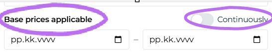 For example, you can create a continuous base pricing that applies to all times without any specific time period defined. In addition, you can set another base pricing valid from June 1 to August 31, 2025. In this case, the property will normally have a continuously valid base pricing, but during the summer season, from June 1 to August 31, 2025, the base pricing specifically set for this period will apply.