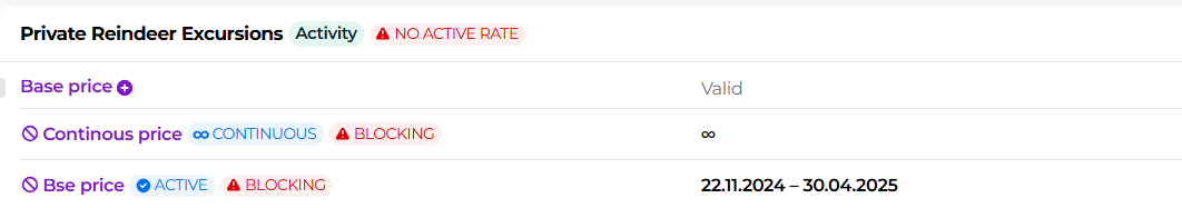 Base pricing represents the standard price of the activity and establishes the basic availability level of the product. It serves as the foundation for all pricing and can later be modified or complemented with special campaign or seasonal pricing. Base pricing provides customers with a clear price for the activity and ensures consistent and transparent pricing across different sales channels.