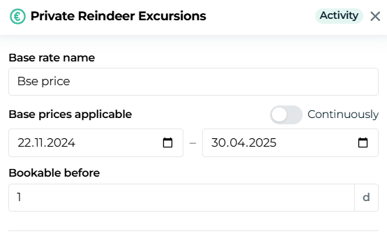 Setting a base price for an activity is an important step to ensure that your product is bookable at the correct price and availability. The base price allows you to define the activity’s basic fee, validity periods, and booking terms, which determine how early customers can make reservations.
