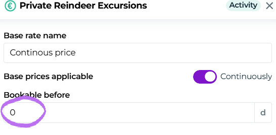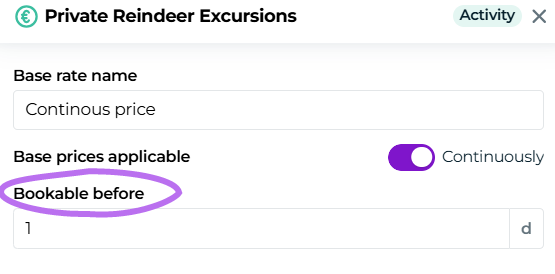 In the "Bookable before" section, you can define how far in advance customers must make a reservation. This setting gives you control over the scheduling of bookings and ensures that you have sufficient preparation time for organizing the activity.